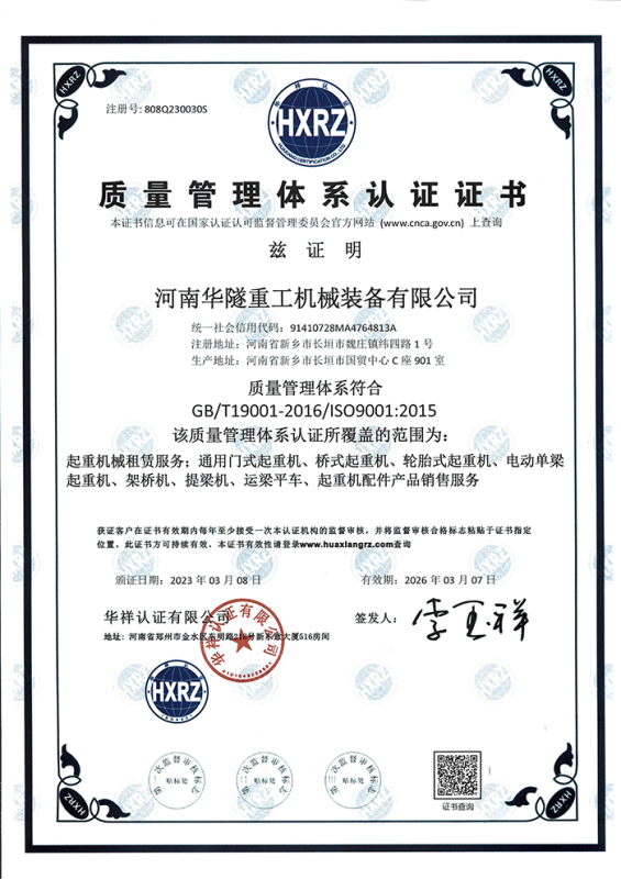 河南華隧重工機械裝備有限公司主要從事通用門式起重機、橋式起重機、電動單梁起重機,輪胎式起重機、架橋機、提梁機、遠梁平車、鋼絲繩電動萌蘆、卷揚機、起重配件制造、銷售:起重機械租賃、安裝和維修,起重設(shè)備園收,機械設(shè)備維修,鋼結(jié)構(gòu)工程承包,橋梁工程及技術(shù)咨淘服務(wù),銷售五金制品、機電設(shè)備:建設(shè)工程監(jiān)理,建設(shè)工程設(shè)計,各類工程建設(shè)活動,建筑勞務(wù)分包,建筑物折除作業(yè),施工作業(yè),工程管理服務(wù),土石方工程施工,裝如發(fā)運。  公司已通過IS0國際質(zhì)量、環(huán)境、健康與安全三合一標(biāo)準(zhǔn)認(rèn)證,特種設(shè)備制造許可證和特種設(shè)備安裝改造維修許可證。擁有完熟的質(zhì)量管理體系。嚴(yán)格的管理制度,強大的生產(chǎn)能力和先進的檢測手段,在保證產(chǎn)品質(zhì)量的同時,也具備了極強的市場競爭力。  公司堅持科技創(chuàng)新為理念,產(chǎn)品質(zhì)量為核心,注重信譽,建立了減信可靠、快捷、思速。便利周到的售后服務(wù)網(wǎng)絡(luò)。  我們擁有的技術(shù)專家和技術(shù)服務(wù)隊伍為客戶提供充善的售前技術(shù)支持和全天候的售后服務(wù)體系,讓您無后顧之憂,享受一站式的超值服務(wù)。  “華隧重工,伴您成功“是華隧重工永遠的宗指,真被的希望與各界朋友攜手并進。共創(chuàng)輝準(zhǔn)!